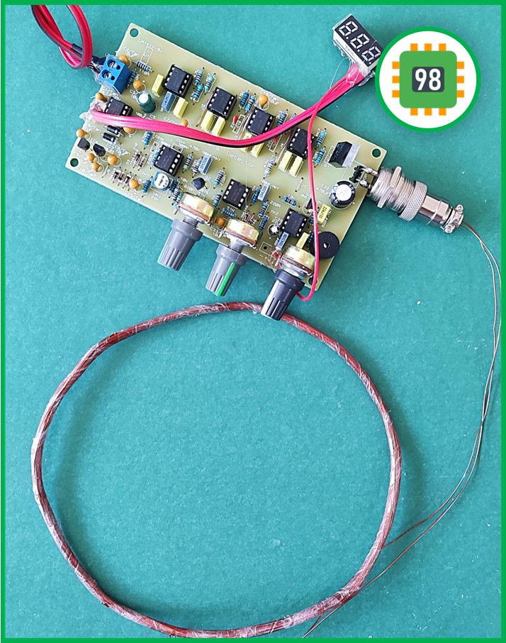 ساخت سیم پیچ جستجوگر برای این کیت فلزیاب بسیار ساده است، ابتدا سیم مسی روکشدار (سیم لاکی) با ضخامت 0.8 میلی متر تهیه نمایید، شما می توانید این سیم را از کارگاههای سیمپیچی موتورهای الکتریکی خریداری کنید، سپس تعداد 16 الی 18 دور از آن را به صورت یک دایره با قطره 45 سانتیمتر به صورت محکم بپیچید و در پایان سیم پیچ را با یک چسب برق به صورت محکم نوار پیچ کنید. لطفا توجه داشته باشید برای اتصال سیم پیچ به کیت حتما از کابل کواکسیال مدل RG58 یا RG59 استفاده کنید.